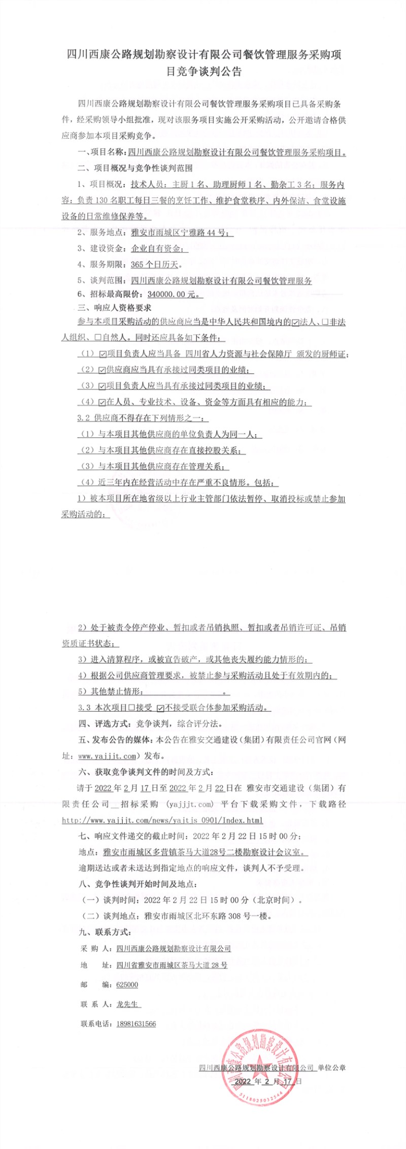 四川西康公路規(guī)劃勘察設(shè)計(jì)有限公司餐飲管理服務(wù)采購項(xiàng)目競(jìng)爭(zhēng)談判公告
