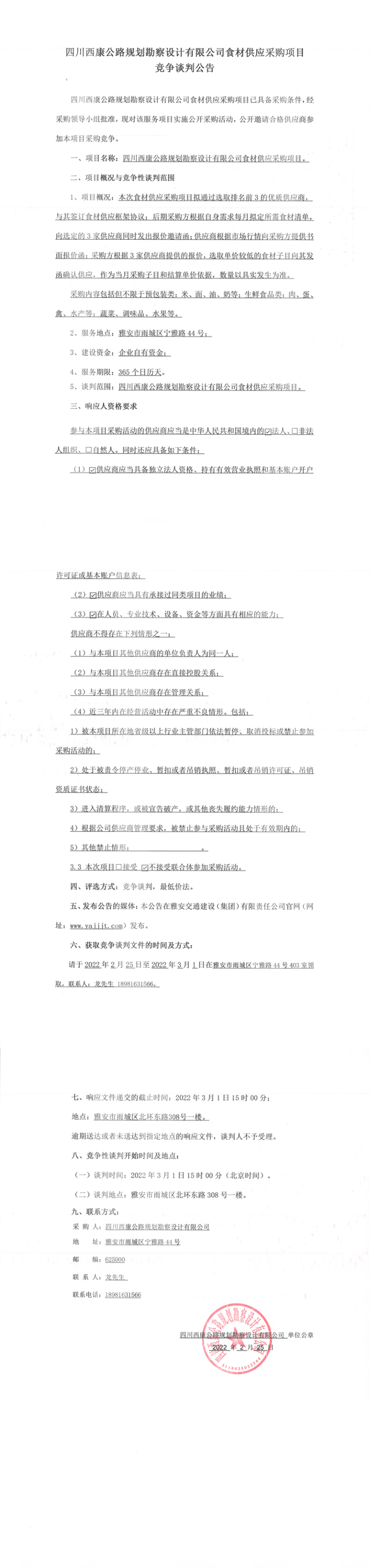 四川西康公路規(guī)劃勘察設計有限公司食材供應采購項目競爭談判公告