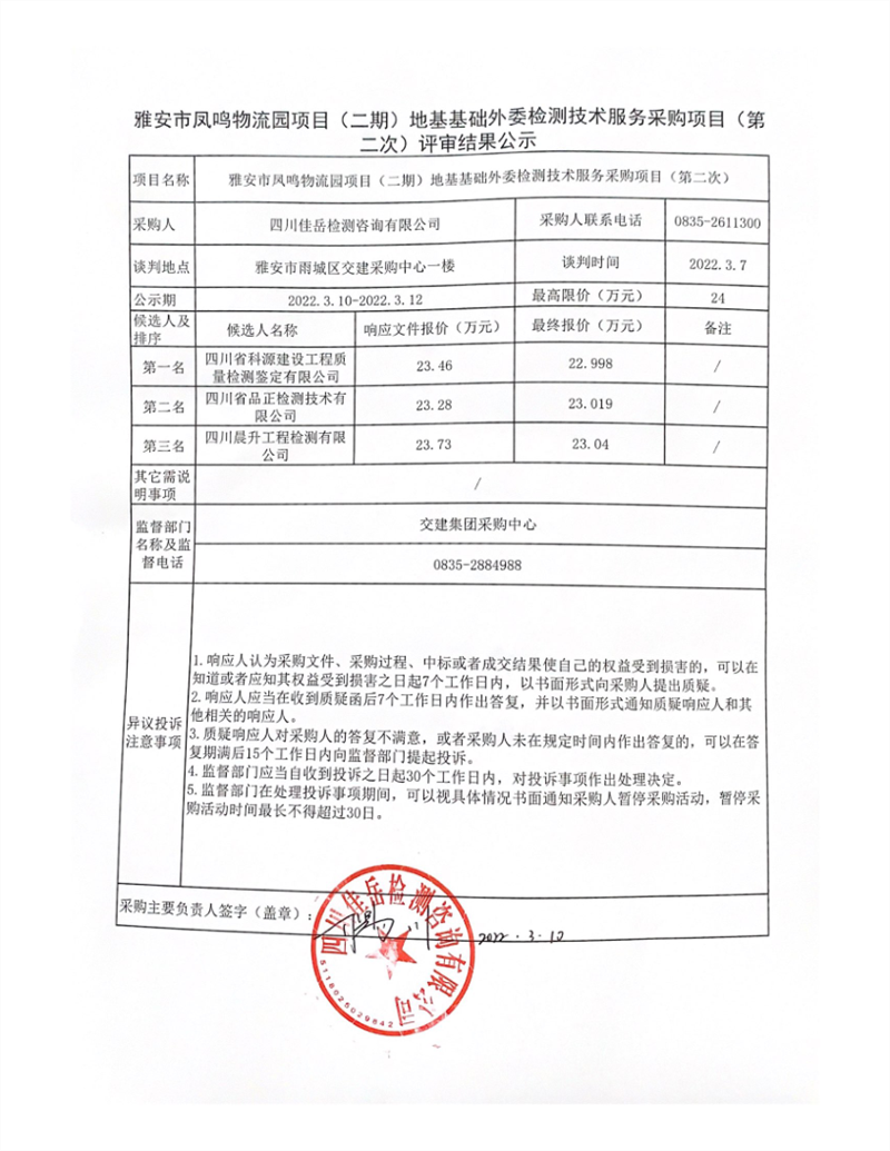 四川佳岳檢測咨詢有限公司雅安市鳳鳴物流園項目(二期)地基基礎(chǔ)外委檢測技術(shù)服務(wù)采購項目(第二次)評審結(jié)果公示