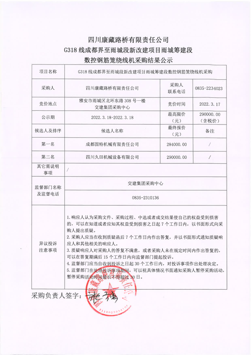 四川康藏路橋有限責(zé)任公司G318線成都界至雨城段新改建項(xiàng)目雨城籌建段數(shù)控鋼筋籠繞線機(jī)采購(gòu)結(jié)果公示