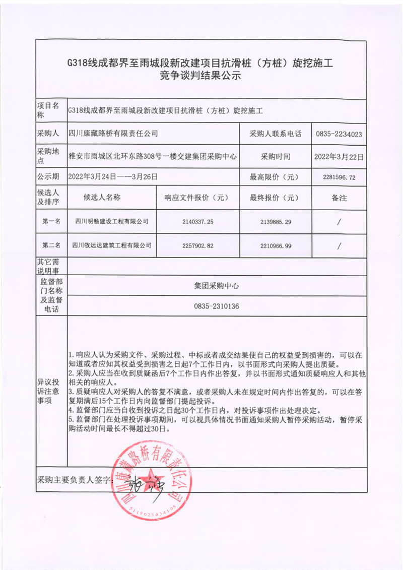 四川康藏路橋有限責(zé)任公司G318線成都界至雨城段新改建項(xiàng)目抗滑樁(方樁)旋挖施工競(jìng)爭(zhēng)談判結(jié)果公示