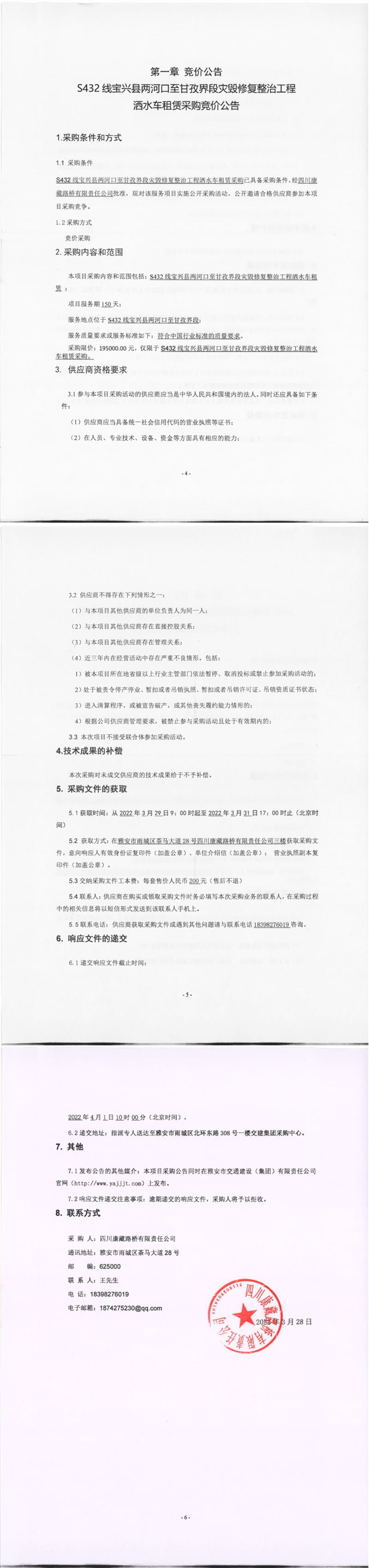 四川康藏路橋有限責(zé)任公司S432線(xiàn)寶興縣兩河口至甘孜界段災(zāi)毀修復(fù)整治工程灑水車(chē)租賃采購(gòu)競(jìng)價(jià)公告