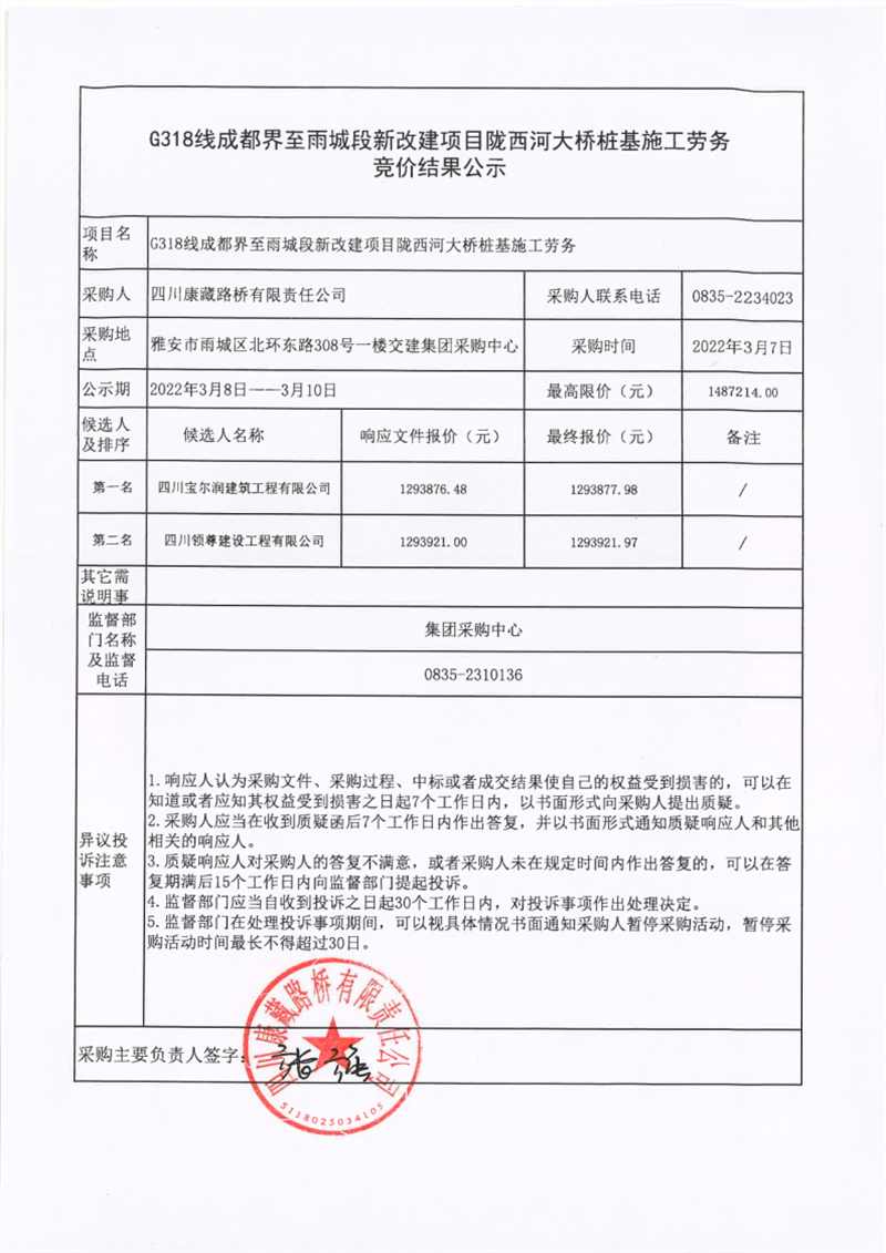 四川康藏路橋有限責(zé)任公司G318線(xiàn)成都界至雨城段新改建項(xiàng)目隴西河大橋樁基施工勞務(wù)競(jìng)價(jià)結(jié)果公示