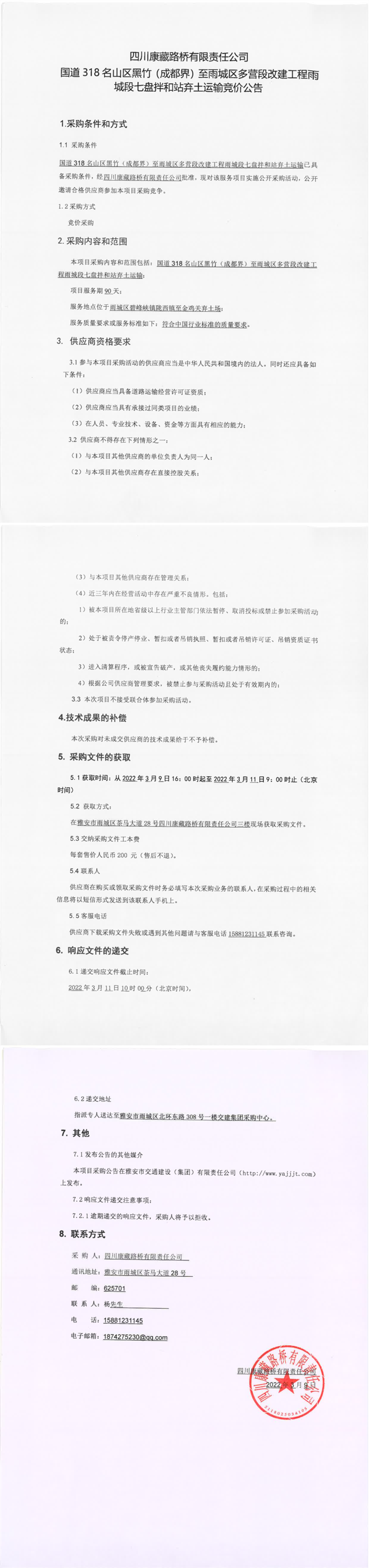 四川康藏路橋有限責(zé)任公司國(guó)道318名山區(qū)黑竹(成都界)至雨城區(qū)多營(yíng)段改建工程雨城段七盤拌和站棄土運(yùn)輸競(jìng)價(jià)公告