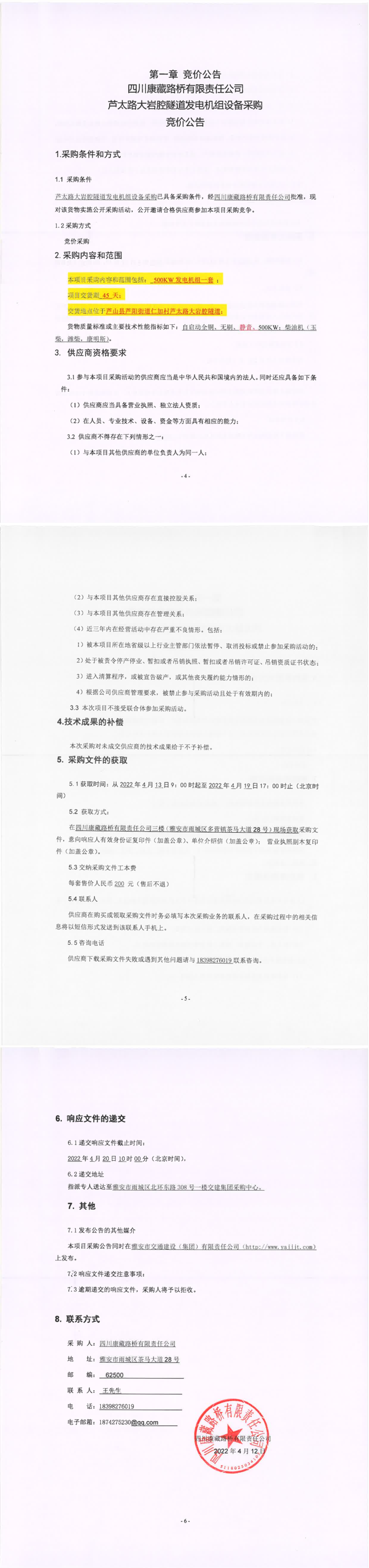 四川康藏路橋有限責(zé)任公司蘆太路大巖腔隧道發(fā)電機組設(shè)備采購競價公告