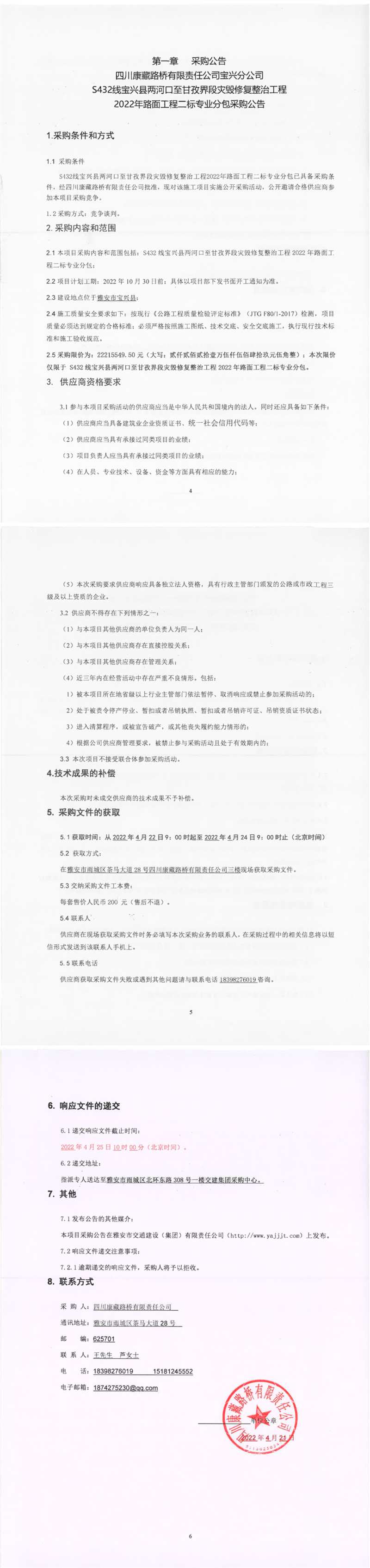 四川康藏路橋有限責(zé)任公司S432線(xiàn)寶興縣兩河口至甘孜界段災(zāi)毀修復(fù)整治工程2022年路面工程二標(biāo)專(zhuān)業(yè)分包采購(gòu)公告
