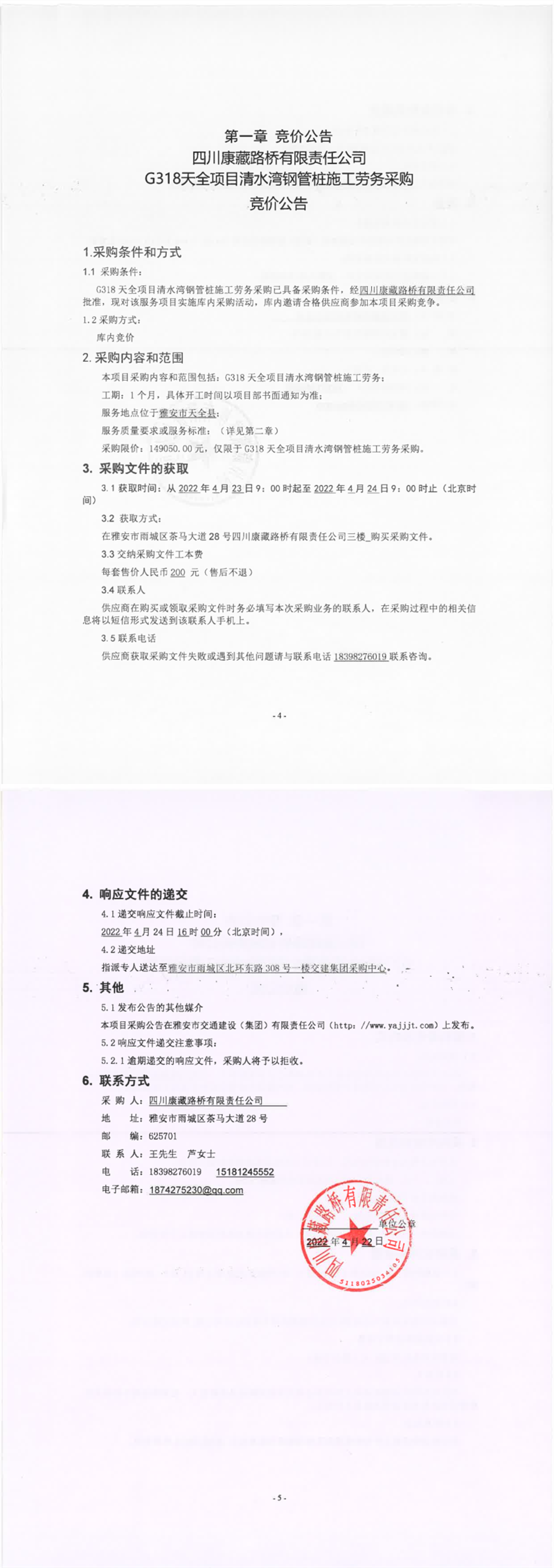 四川康藏路橋有限責(zé)任公司G318天全項(xiàng)目清水灣鋼管樁施工勞務(wù)采購(gòu)競(jìng)價(jià)公告