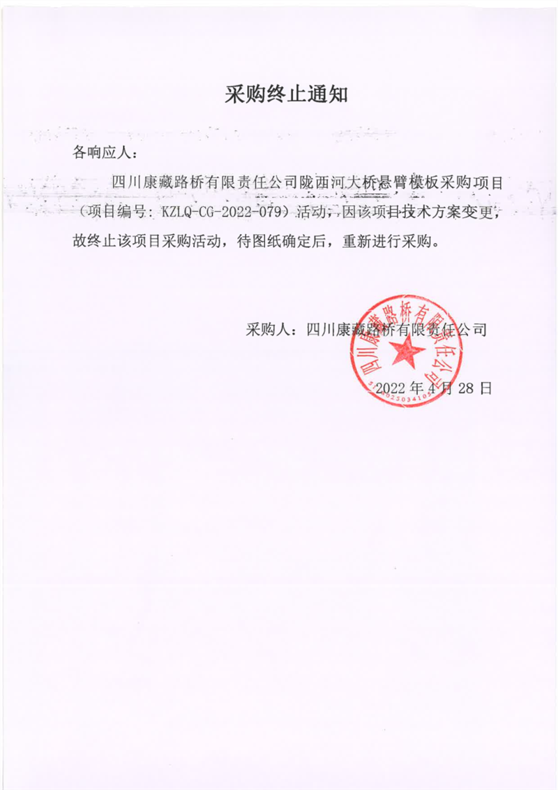 四川康藏路橋有限責(zé)任公司隴西河大橋懸臂模板采購(gòu)終止通知