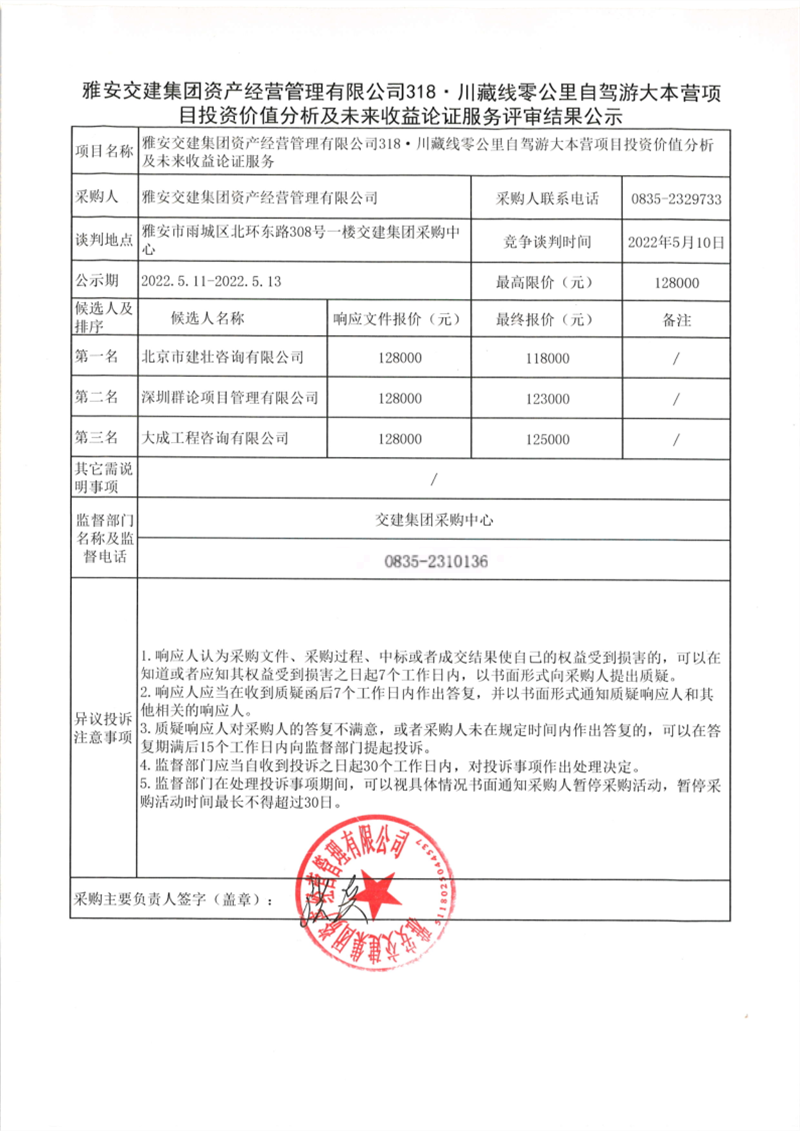 雅安交建集團(tuán)資產(chǎn)經(jīng)營管理有限公司318·川藏線零公里自駕游大本營項(xiàng)目投資價值分析及未來收益論證服務(wù)評審結(jié)果公示
