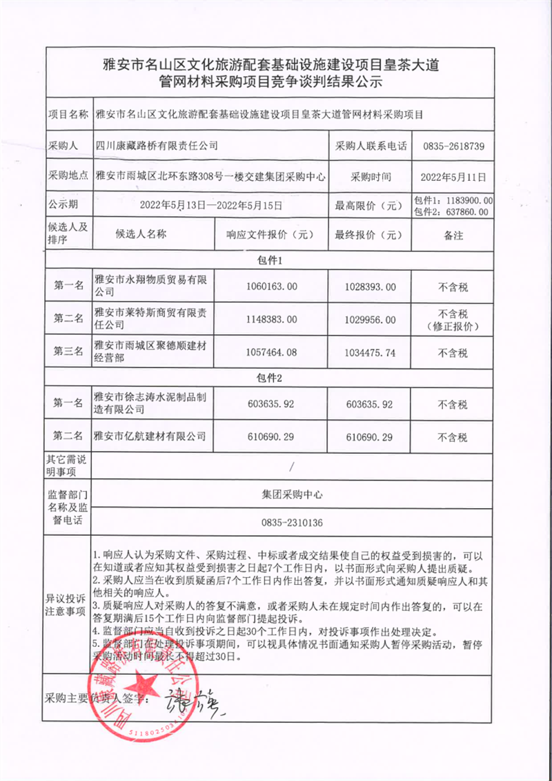 四川康藏路橋有限責(zé)任公司雅安市名山區(qū)文化旅游配套基礎(chǔ)設(shè)施建設(shè)項(xiàng)目皇茶大道管網(wǎng)材料采購(gòu)項(xiàng)目競(jìng)爭(zhēng)談判結(jié)果公示