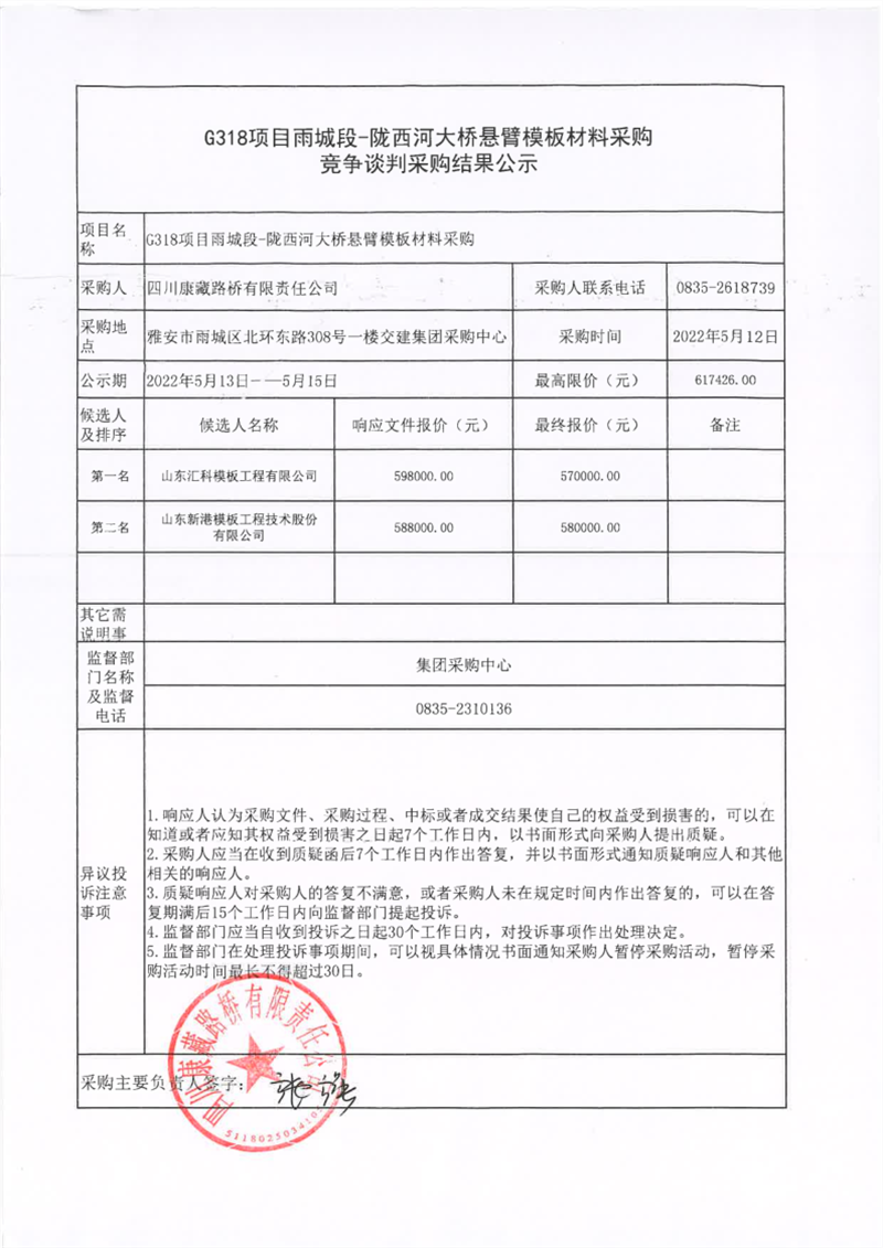 四川康藏路橋有限責(zé)任公司G318項(xiàng)目雨城段-隴西河大橋懸臂模板材料采購競(jìng)爭談判采購結(jié)果公示