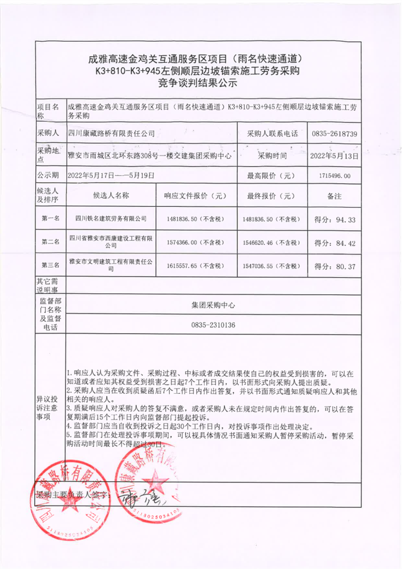 四川康藏路橋有限責(zé)任公司成雅高速金雞關(guān)互通服務(wù)區(qū)項(xiàng)目(雨名快速通道)K3+810-K3+945左側(cè)順層邊坡錨索施工勞務(wù)采購競(jìng)爭(zhēng)談判結(jié)果公示