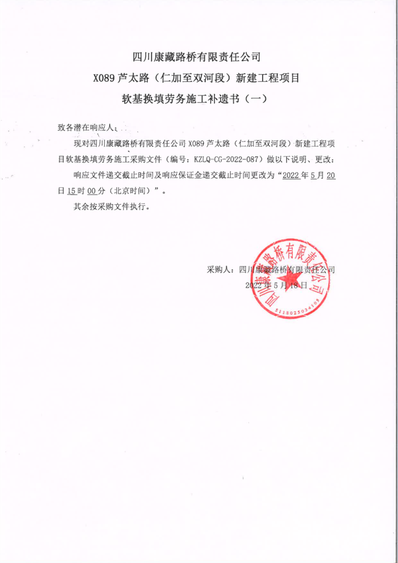 四川康藏路橋有限責任公司X089蘆太路(仁加至雙河段)新建工程項目軟基換填勞務施工補遺書(一)