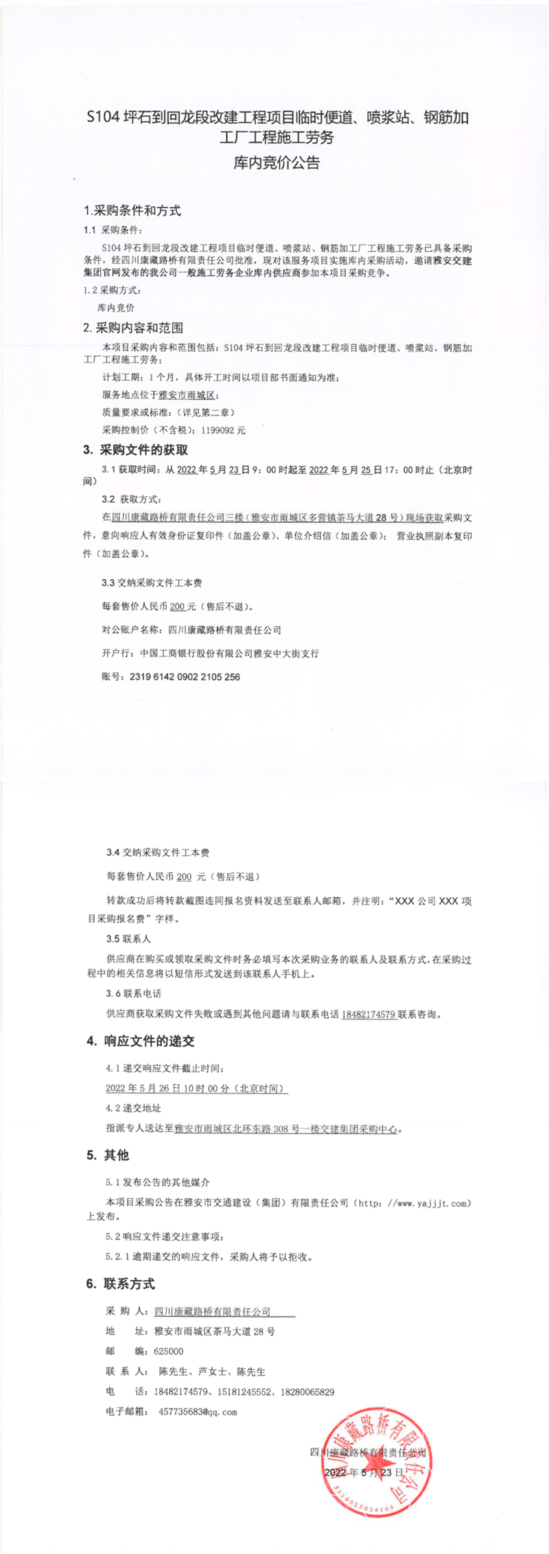 四川康藏路橋有限責(zé)任公司S104坪石到回龍段改建工程項(xiàng)目臨時(shí)便道、噴漿站、鋼筋加工廠工程施工勞務(wù)庫內(nèi)競(jìng)價(jià)公告