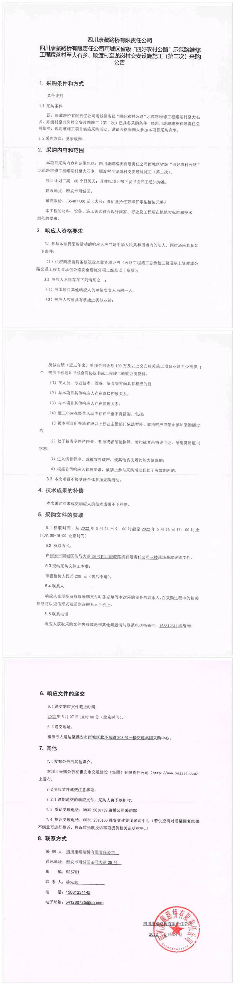 四川康藏路橋有限責(zé)任公司雨城區(qū)省級(jí)“四好農(nóng)村公路”示范路維修工程藏茶村至大石鄉(xiāng)、順渡村至龍崗村交安設(shè)施施工(第二次)采購公告
