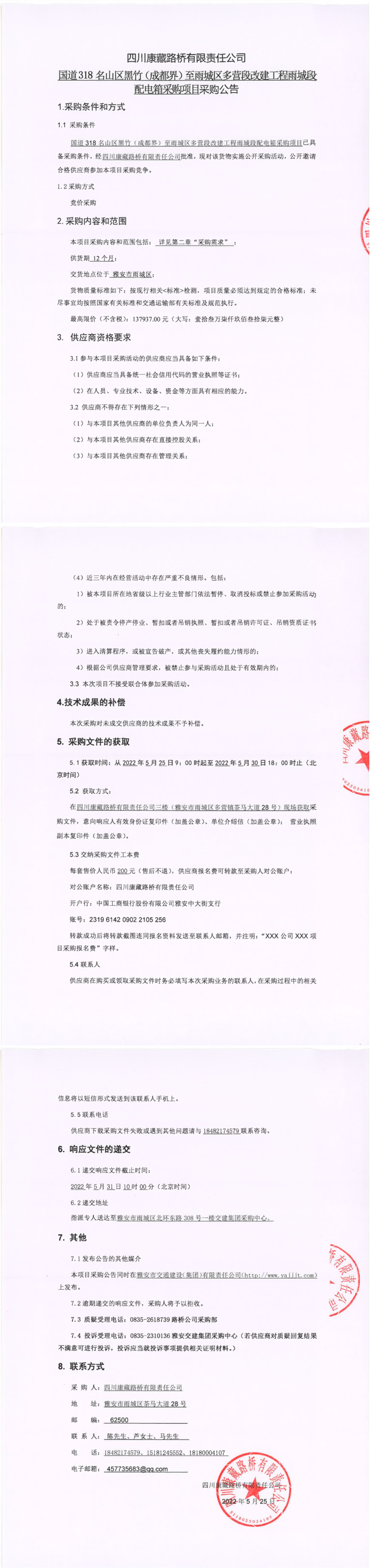 四川康藏路橋有限責(zé)任公司國道318名山區(qū)黑竹(成都界)至雨城區(qū)多營段改建工程雨城段配電箱采購項目采購公告