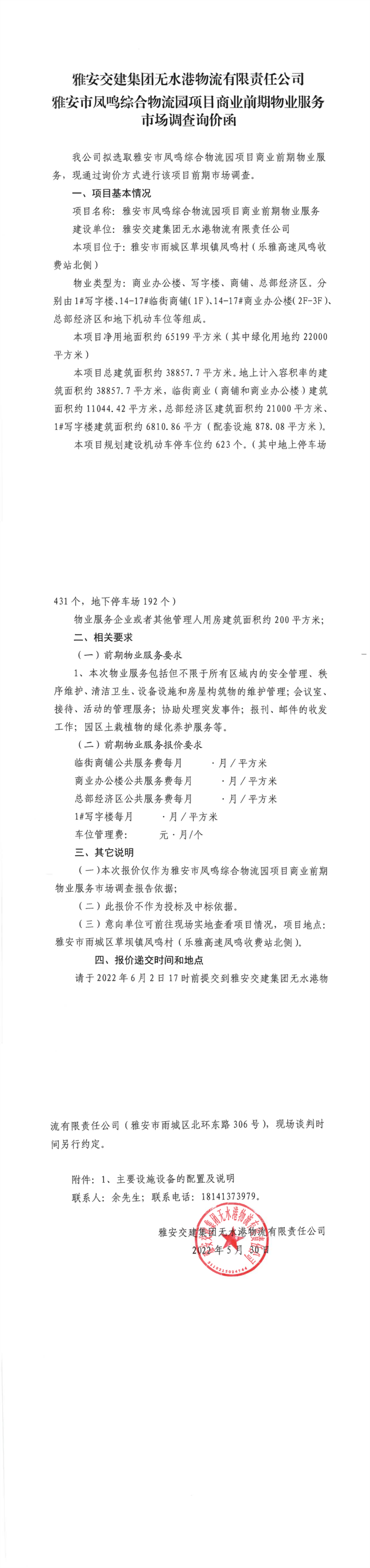 雅安交建集團無水港物流有限責任公司雅安市鳳鳴綜合物流園項目商業(yè)前期物業(yè)服務市場調查詢價函