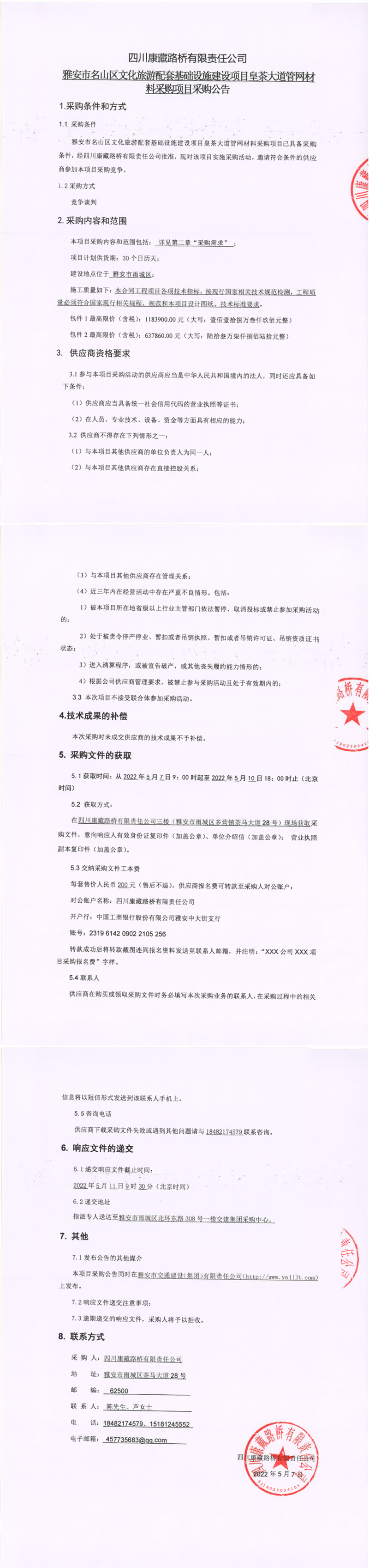 四川康藏路橋有限責(zé)任公司雅安市名山區(qū)文化旅游配套基礎(chǔ)設(shè)施建設(shè)項目皇茶大道管網(wǎng)材料采購項目采購公告