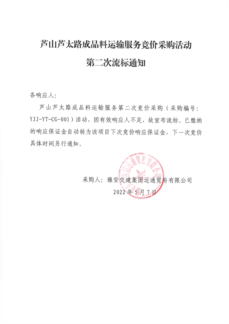 雅安交建集團(tuán)運(yùn)通貿(mào)易有限公司蘆山蘆太路成品料運(yùn)輸服務(wù)競價采購活動第二次流標(biāo)通知