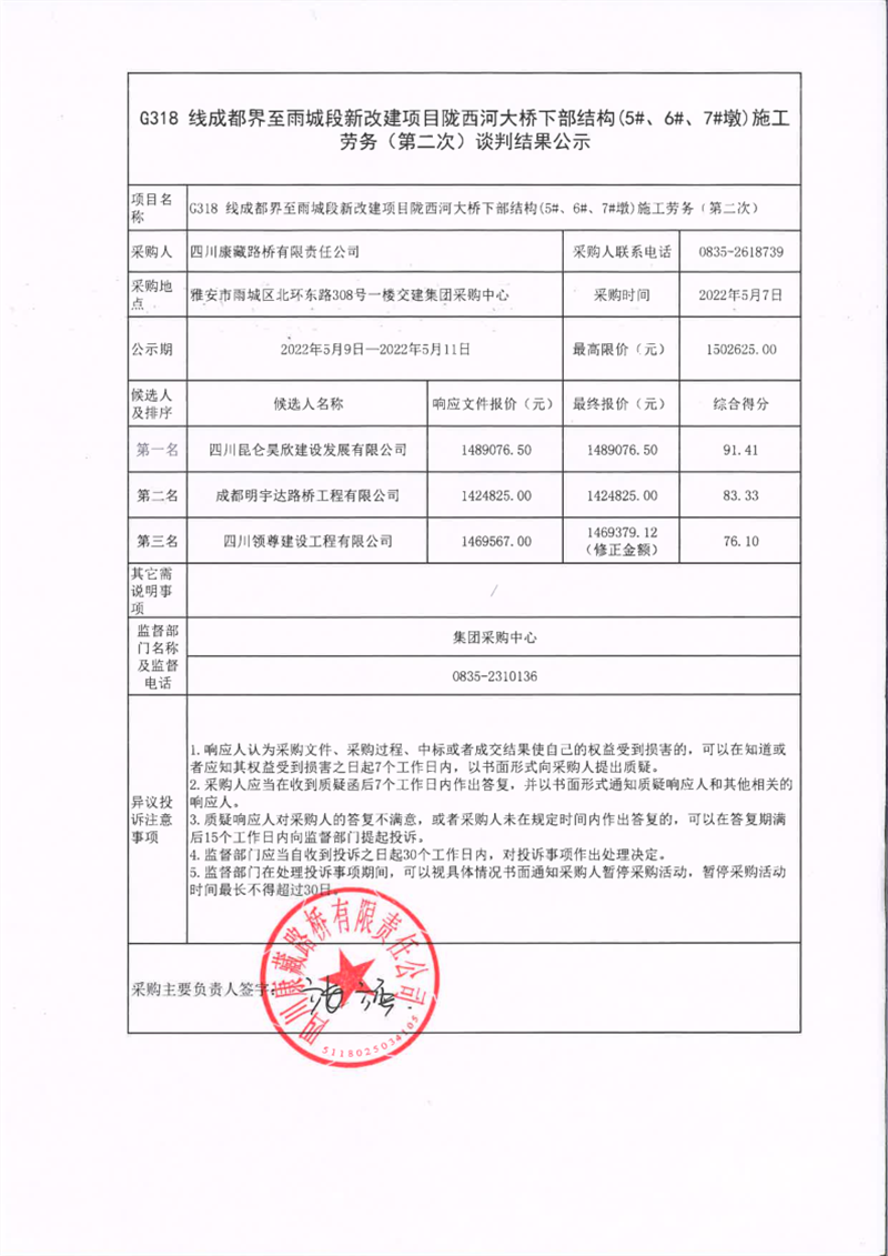 四川康藏路橋有限責任公司G318線成都界至雨城段新改建項目隴西河大橋下部結(jié)構(gòu)(5#、6#、7#墩)施工勞務(wù)(第二次)談判結(jié)果公示