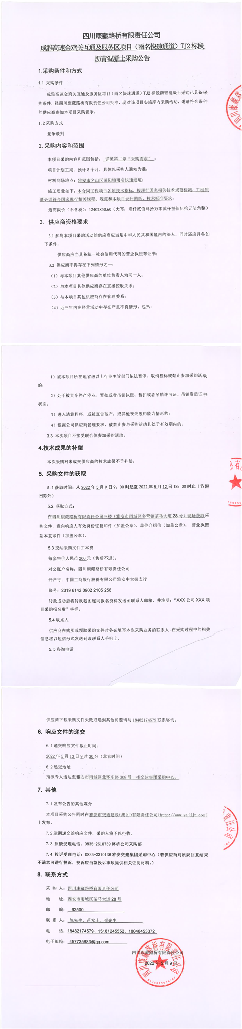 四川康藏路橋有限責任公司成雅高速金雞關(guān)互通及服務區(qū)項目(雨名快速通道)TJ2標段瀝青混凝土采購公告
