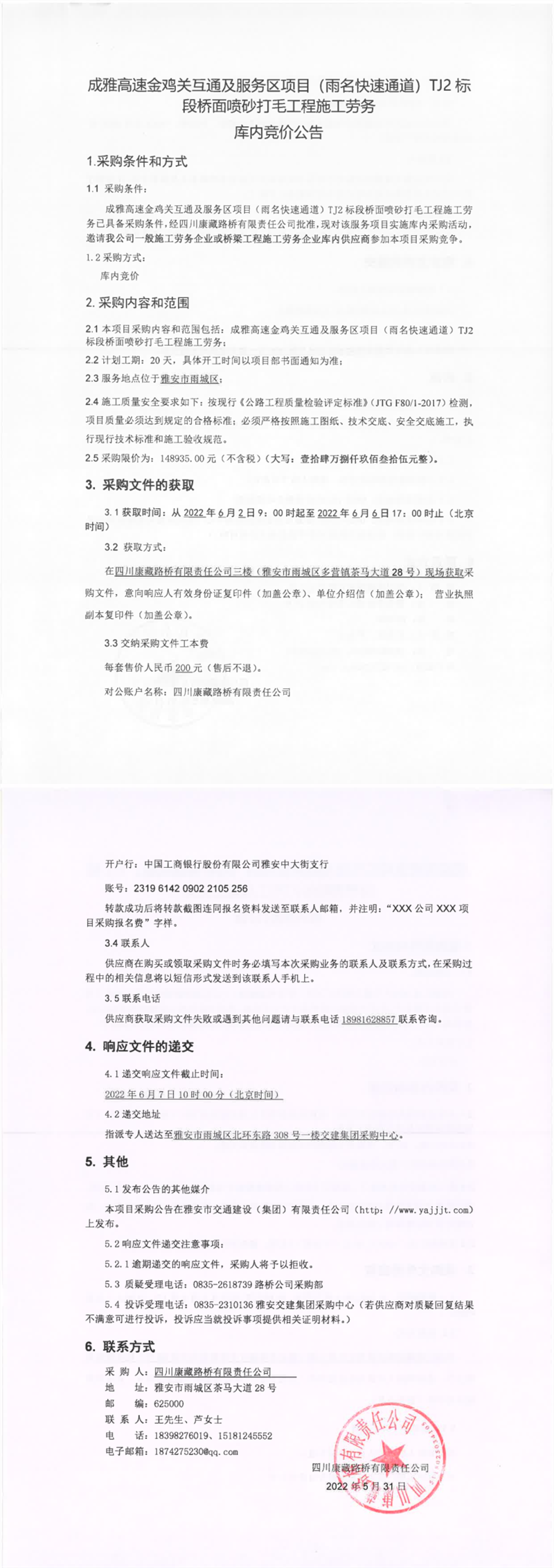 四川康藏路橋有限責(zé)任公司成雅高速金雞關(guān)互通及服務(wù)區(qū)項(xiàng)目(雨名快速通道)TJ2標(biāo)段橋面噴砂打毛工程施工勞務(wù)庫(kù)內(nèi)競(jìng)價(jià)公告