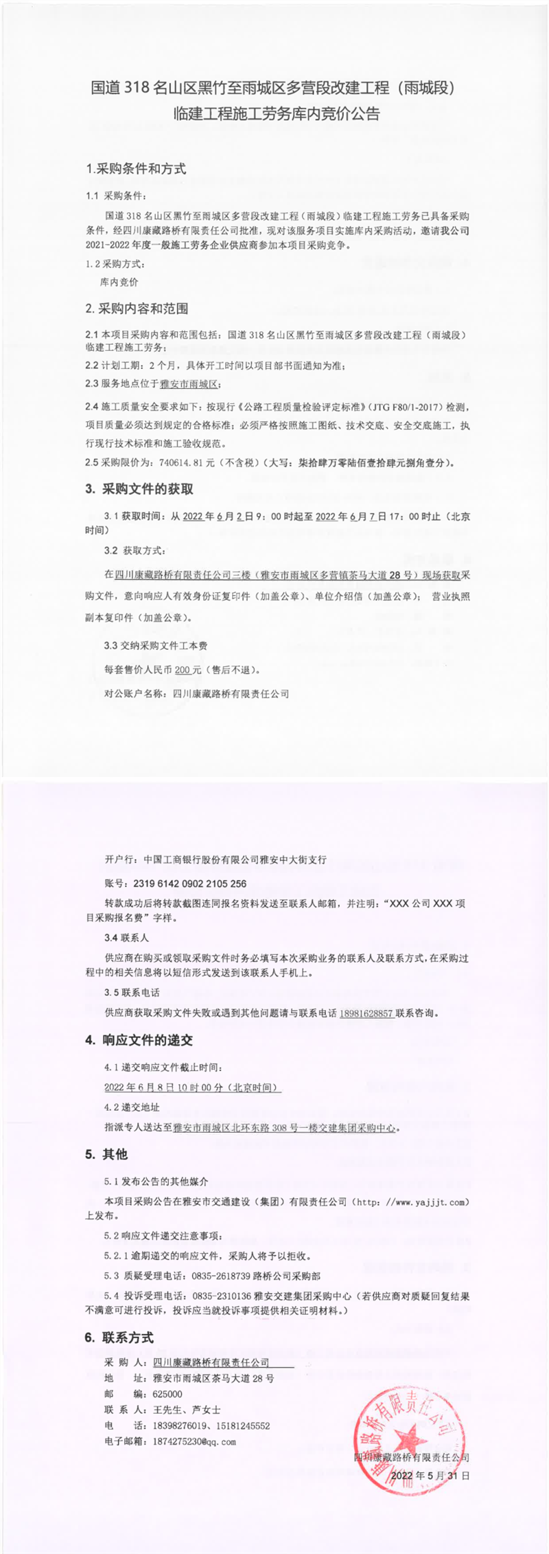 四川康藏路橋有限責(zé)任公司國道318名山區(qū)黑竹至雨城區(qū)多營段改建工程(雨城段)臨建工程施工勞務(wù)庫內(nèi)競價公告