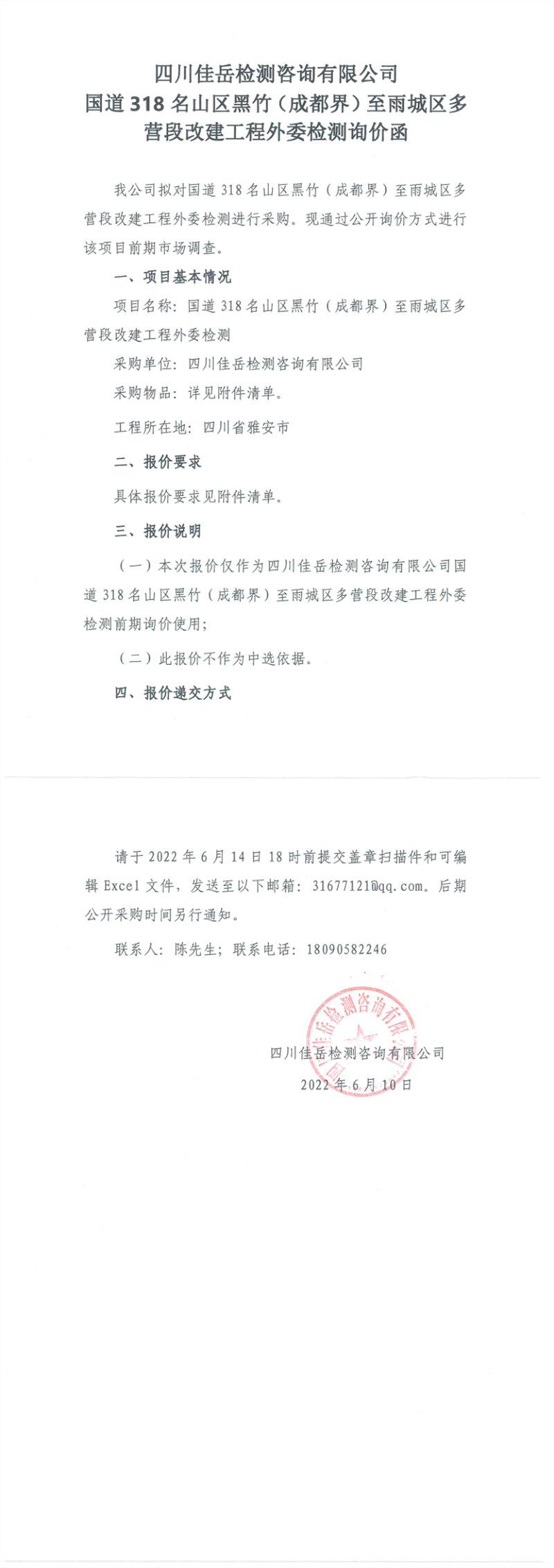 四川佳岳檢測(cè)咨詢(xún)有限公司國(guó)道318名山區(qū)黑竹(成都界)至雨城區(qū)多營(yíng)段改建工程外委檢測(cè)詢(xún)價(jià)函