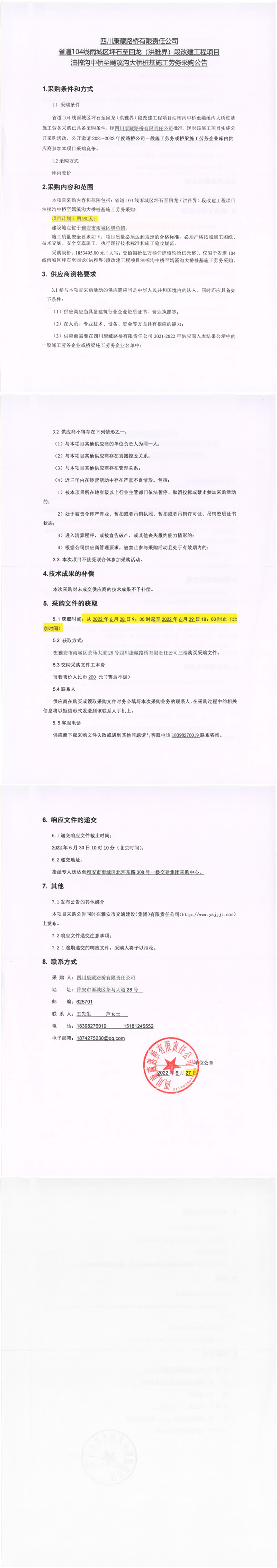 四川康藏路橋有限責(zé)任公司省道104線(xiàn)雨城區(qū)坪石至回龍(洪雅界)段改建工程項(xiàng)目錢(qián)壩大橋、望魚(yú)大橋樁基及鋼便橋工程施工勞務(wù)采購(gòu)公告
