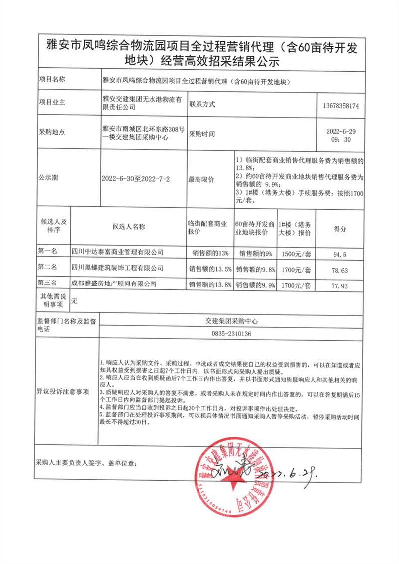 雅安交建集團無水港物流有限責(zé)任公司雅安市鳳鳴綜合物流園項目全過程營銷代理(含60畝待開發(fā)地塊)經(jīng)營高效招采結(jié)果公示