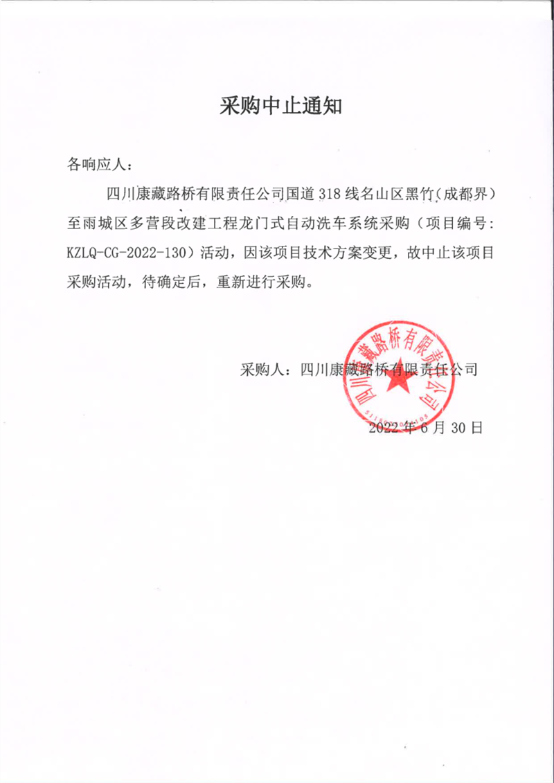 四川康藏路橋有限責(zé)任公司國(guó)道318線名山區(qū)黑竹(成都界)至雨城區(qū)多營(yíng)段改建工程龍門式自動(dòng)洗車系統(tǒng)采購(gòu)中止通知