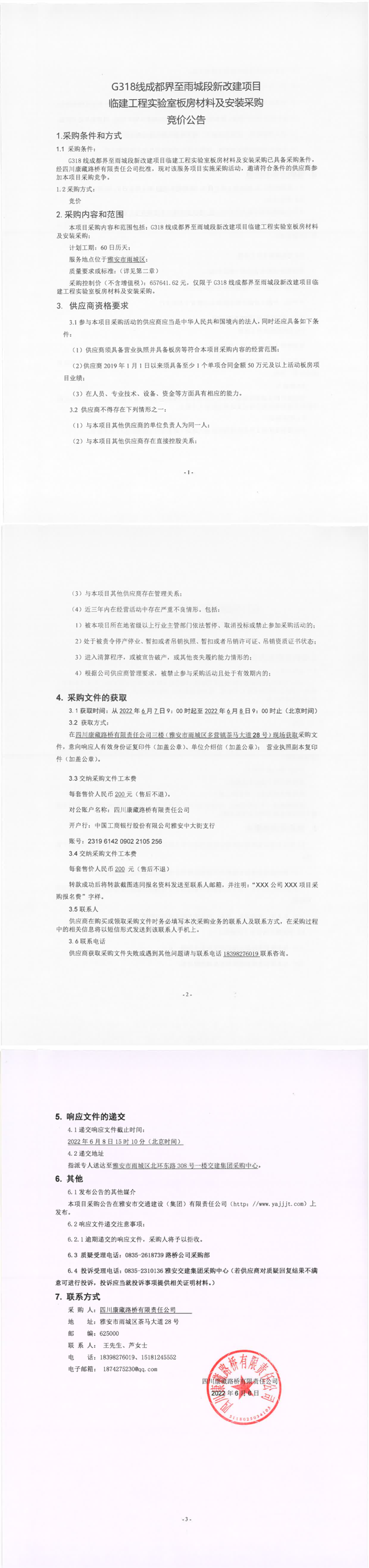 四川康藏路橋有限責(zé)任公司G318線成都界至雨城段新改建項(xiàng)目臨建工程實(shí)驗(yàn)室板房材料及安裝采購(gòu)競(jìng)價(jià)公告