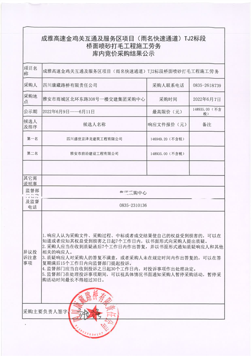 四川康藏路橋有限責(zé)任公司成雅高速金雞關(guān)互通服務(wù)區(qū)項目(雨名快速通道)TJ2標(biāo)段橋面噴砂打毛工程施工勞務(wù)庫內(nèi)競價采購結(jié)果公示