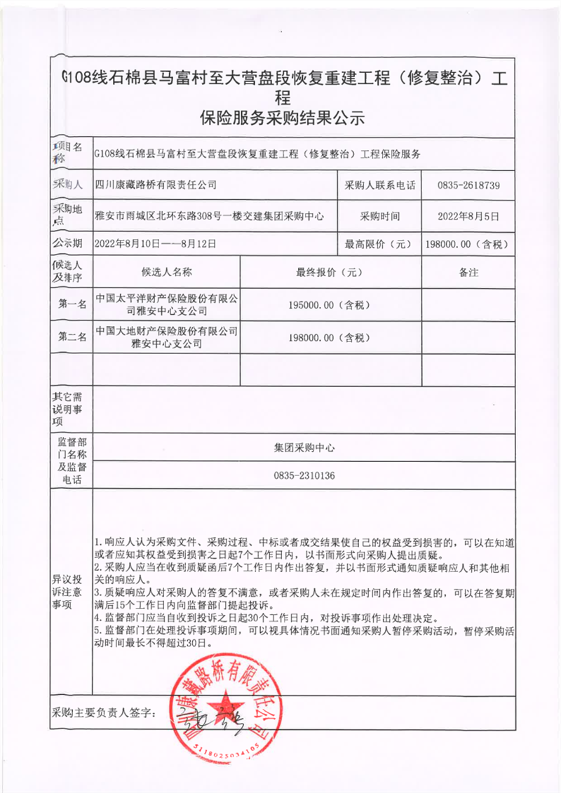 四川康藏路橋有限責任公司G108線石棉縣馬富村至大營盤段恢復(fù)重建工程(修復(fù)整治)工程保險服務(wù)采購結(jié)果公示