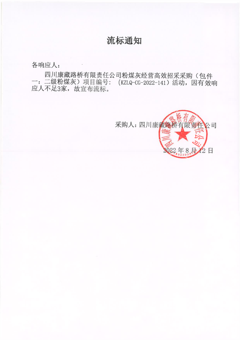四川康藏路橋有限責任公司粉煤灰經營高效招采采購(包件一:二級粉煤灰)流標通知
