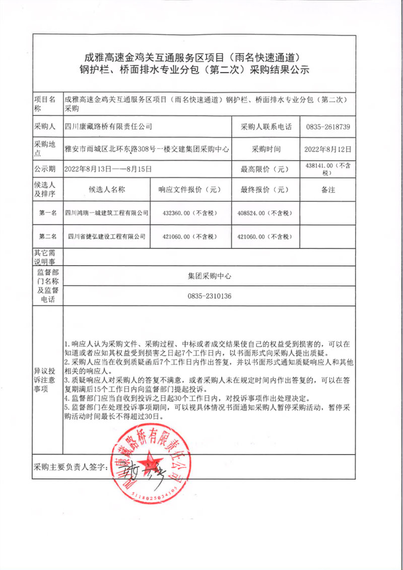 四川康藏路橋有限責任公司成雅高速金雞關互通服務區(qū)項目(雨名快速通道)鋼護欄、橋面排水專業(yè)分包(第二次)采購結(jié)果公示