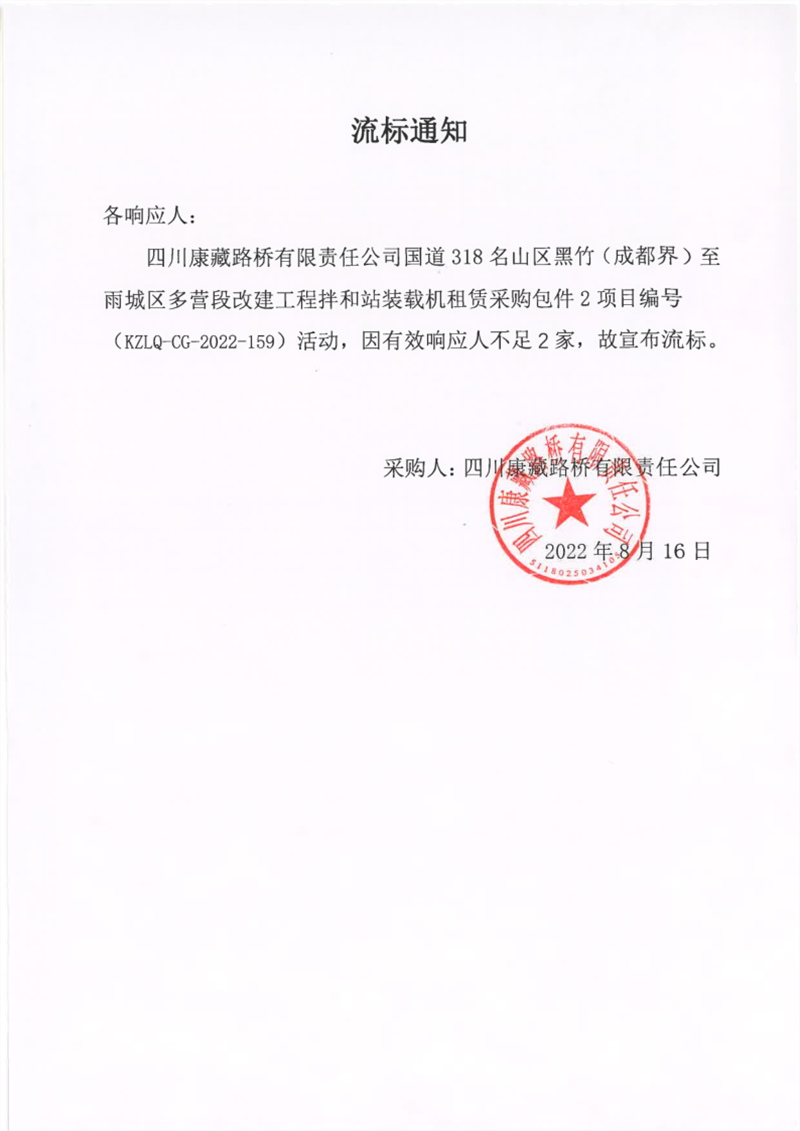 四川康藏路橋有限責(zé)任公司國道318名山區(qū)黑竹(成都界)至雨城區(qū)多營段改建工程拌和站裝載機(jī)租賃采購包件2項(xiàng)目流標(biāo)通知