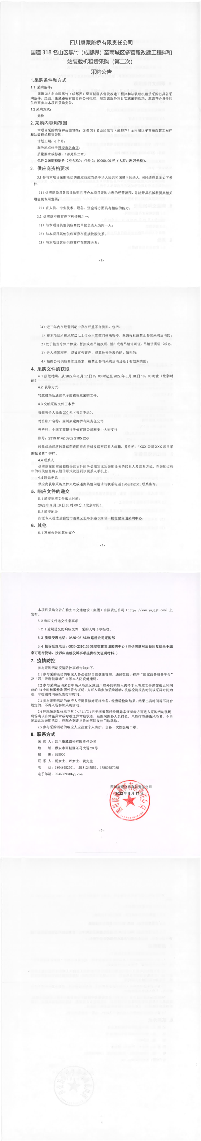 四川康藏路橋有限責(zé)任公司國(guó)道318名山區(qū)黑竹(成都界)至雨城區(qū)多營(yíng)段改建工程拌和站裝載機(jī)租賃采購(gòu)(第二次)采購(gòu)公告