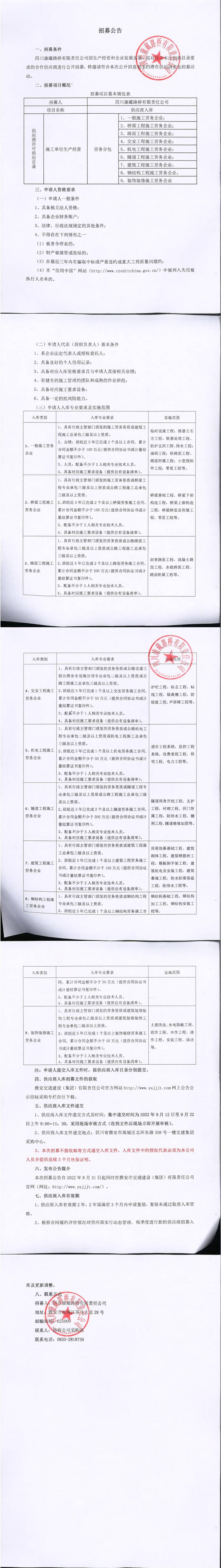 四川康藏路橋有限責任公司2022年第三季度供應商入庫招募公告