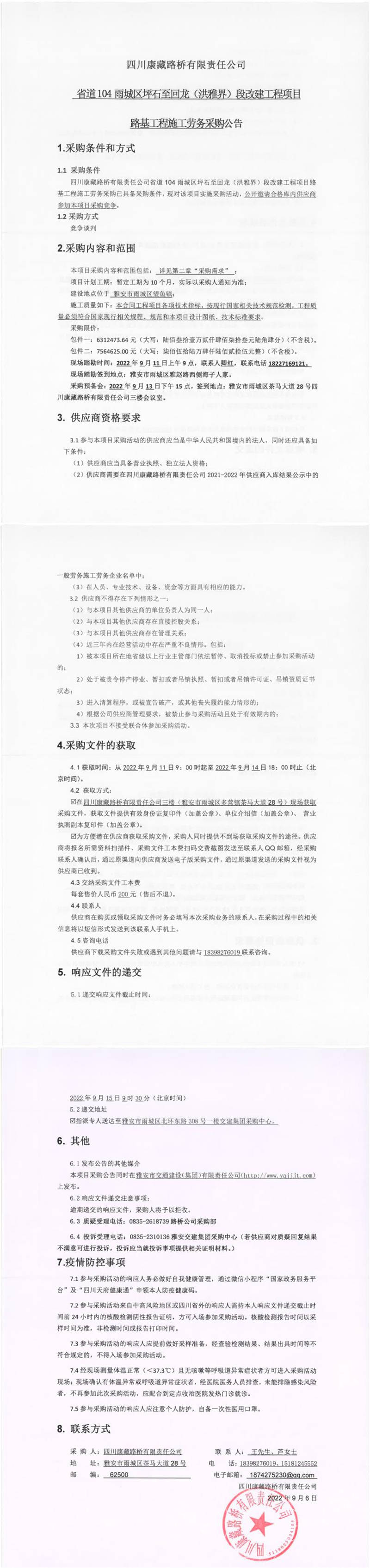 四川康藏路橋有限責任公司省道104雨城區(qū)坪石至回龍(洪雅界)段改建工程項目路基工程施工勞務采購公告