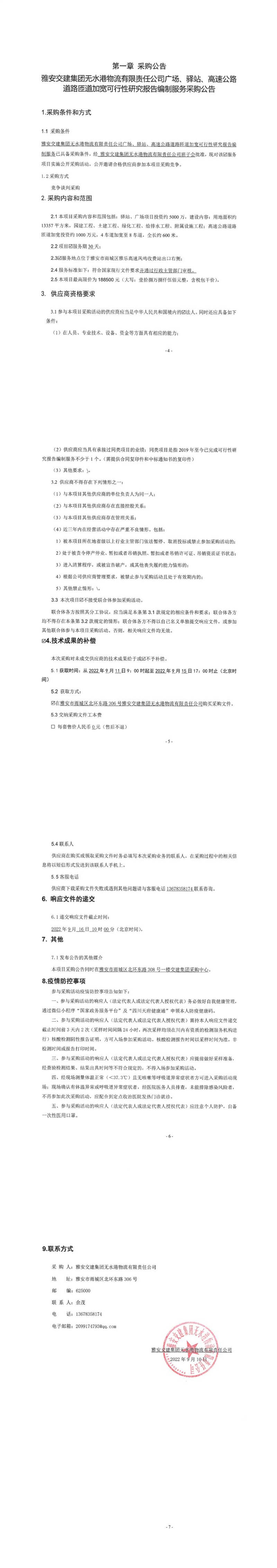 雅安交建集團(tuán)無(wú)水港物流有限責(zé)任公司廣場(chǎng)、驛站、高速公路道路匝道加寬可行性研究報(bào)告編制服務(wù)采購(gòu)公告