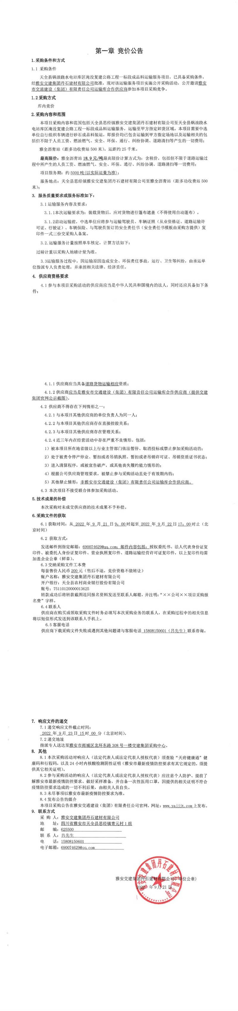 雅安交建集團丹石建材有限公司天全縣鍋浪蹺水電站庫區(qū)淹沒復(fù)建公路工程一標(biāo)段成品料運輸服務(wù)項目競價公告