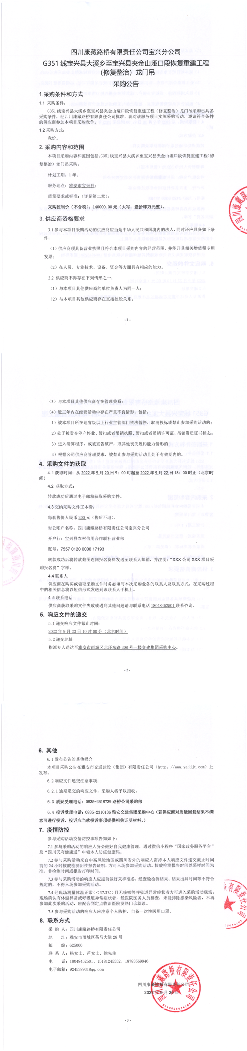 四川康藏路橋有限責(zé)任公司寶興分公司G351大溪鄉(xiāng)至寶興縣夾金山埡口段恢復(fù)重建工程(修復(fù)整治)龍門吊采購公告