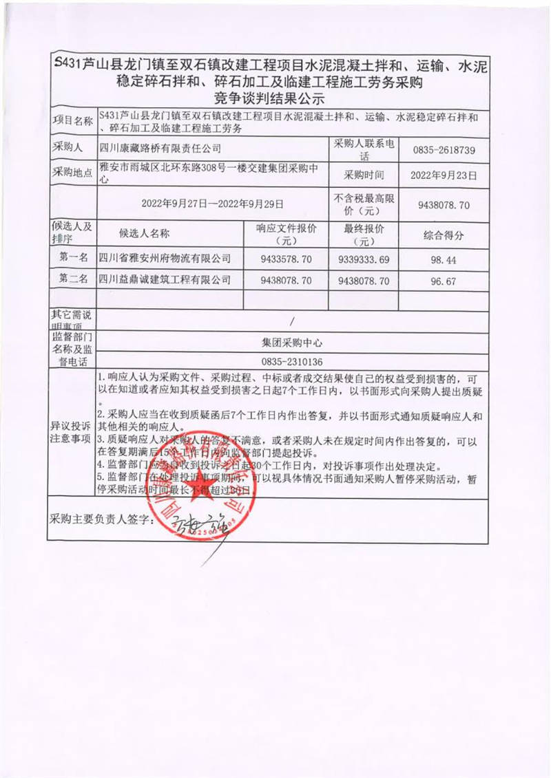 四川康藏路橋有限責任公司S431蘆山縣龍門鎮(zhèn)至雙石鎮(zhèn)改建工程項目水泥混凝土拌和、運輸、水泥穩(wěn)定碎石拌和、碎石加工及臨建工程施工勞務采購競爭談判結果公示