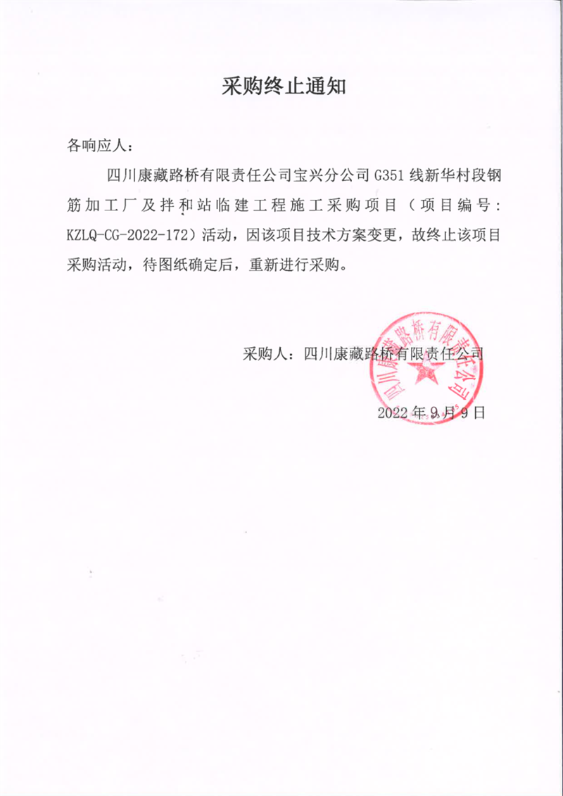 四川康藏路橋有限責任公司寶興分公司G351線新華村段鋼筋加工廠及拌合站臨建工程施工采購項目采購終止通知