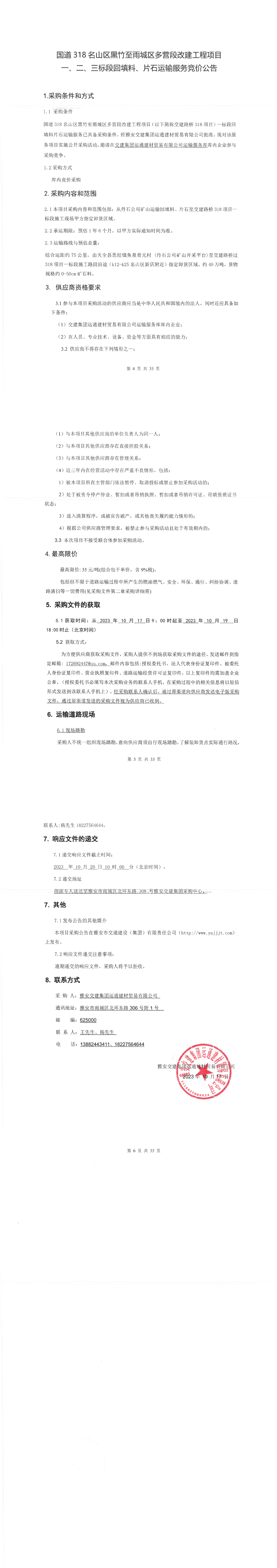 雅安交建集團運通建材貿(mào)易有限公司國道名山區(qū)黑竹至雨城區(qū)多營段改建工程項目一、二、三標段回填料、片石運輸服務(wù)競價公告