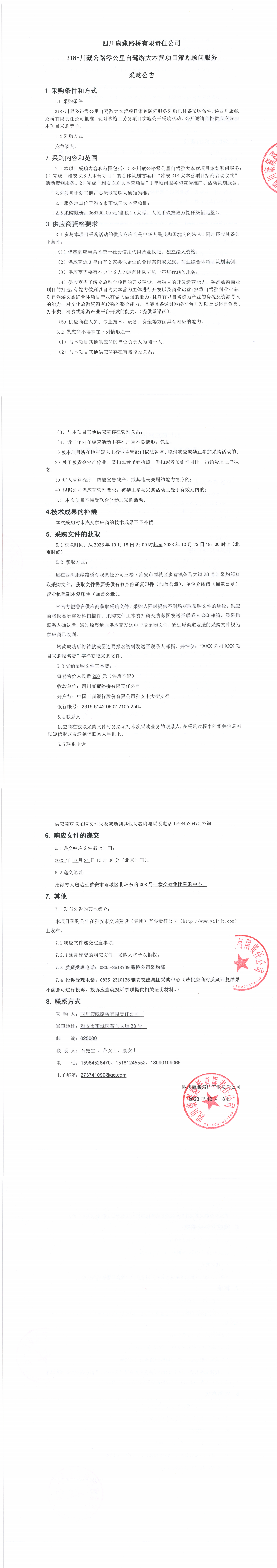 四川康藏路橋有限責任公司318•川藏公路零公里自駕游大本營項目策劃顧問服務采購公告