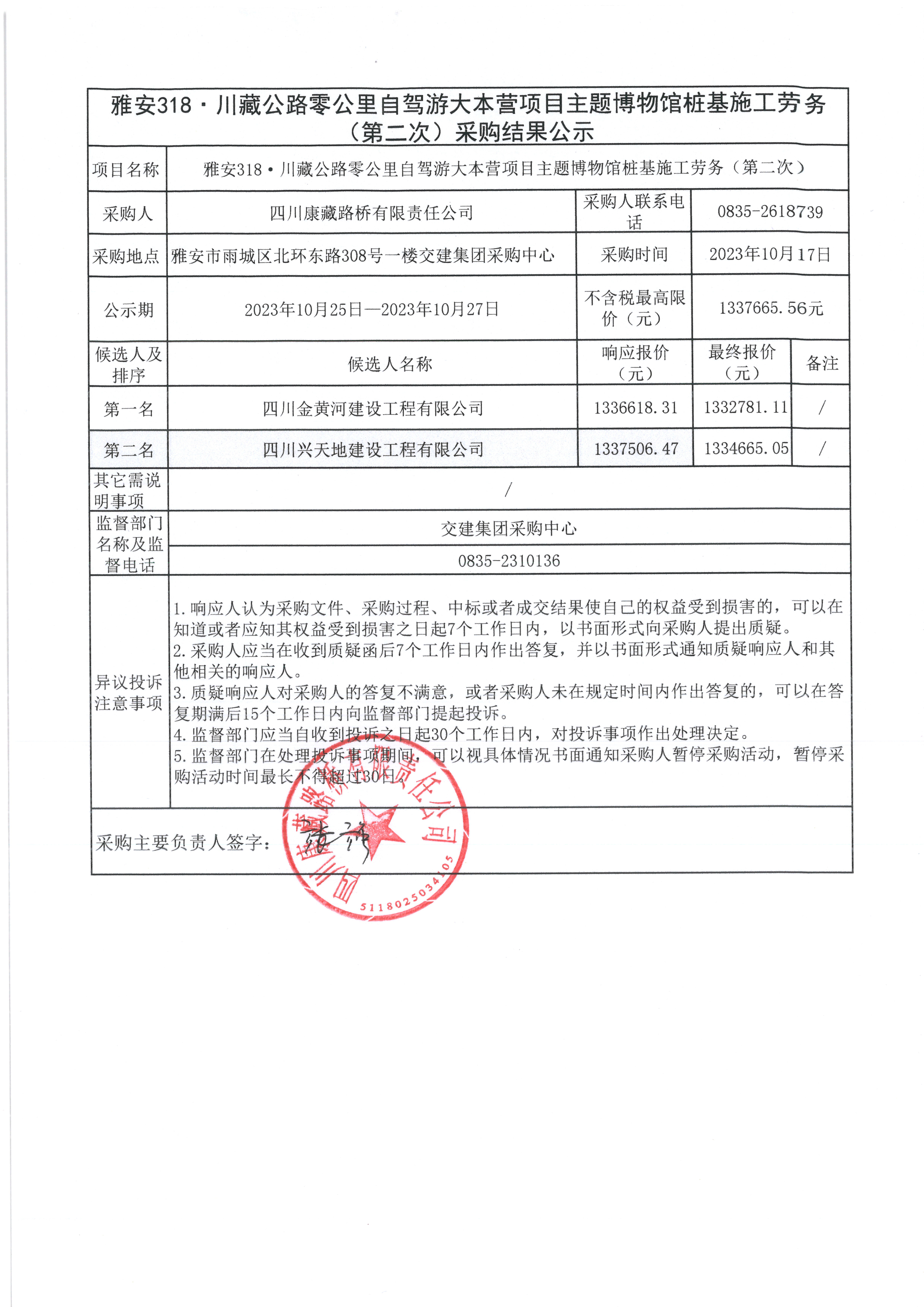 四川康藏路橋有限責(zé)任公司雅安318·川藏公路零公里自駕游大本營項(xiàng)目主題博物館樁基施工勞務(wù)(第二次)采購結(jié)果公示