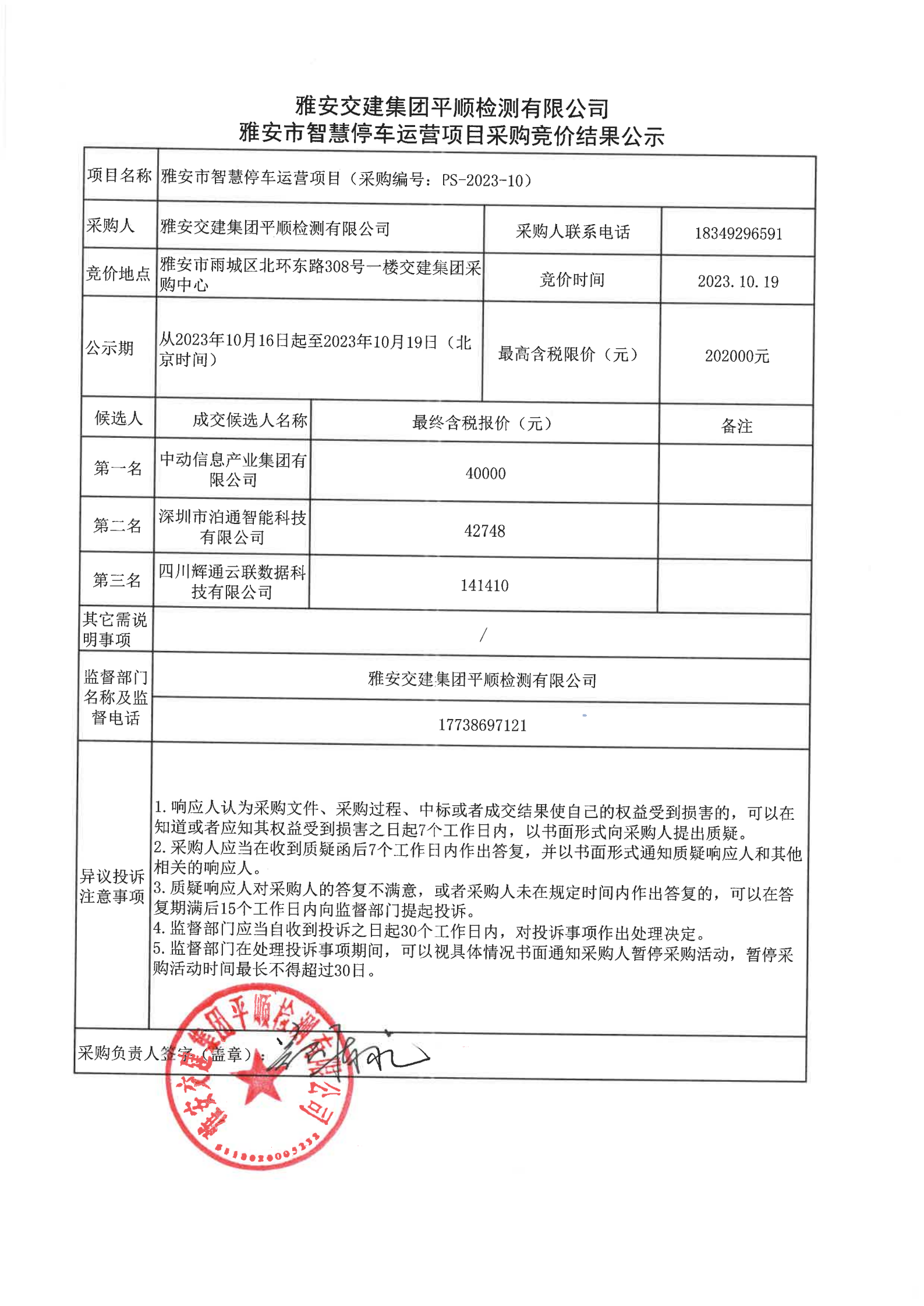 雅安交建集團(tuán)平順檢測有限公司雅安市智慧停車運(yùn)營項(xiàng)目采購競價(jià)結(jié)果公示