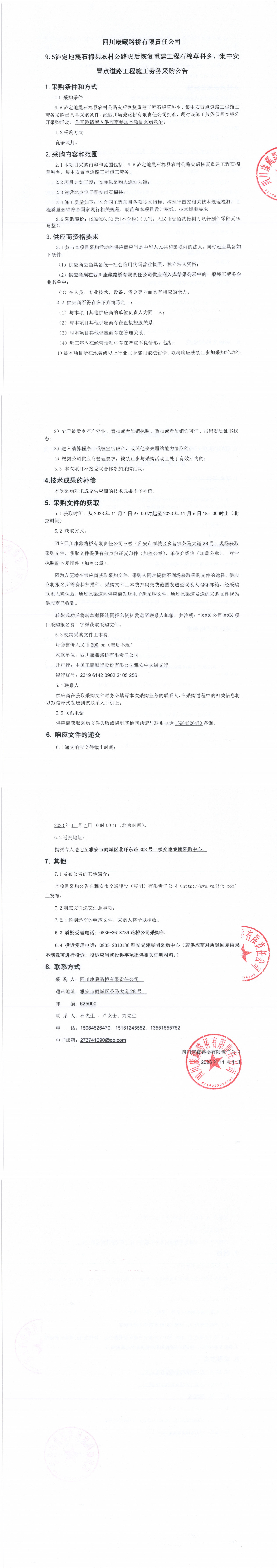 四川康藏路橋有限責(zé)任公司9.5瀘定地震石棉縣農(nóng)村公路災(zāi)后恢復(fù)重建工程石棉草科鄉(xiāng)、集中安置點(diǎn)道路工程施工勞務(wù)采購(gòu)公告